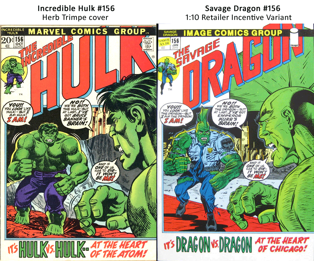 Variant di Savage Dragon #156 che omaggia Incredible Hulk #156 di Herb Trimpe, albo fondamentale per Erik Larsen