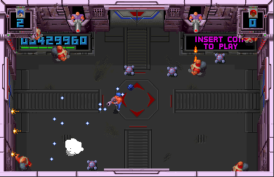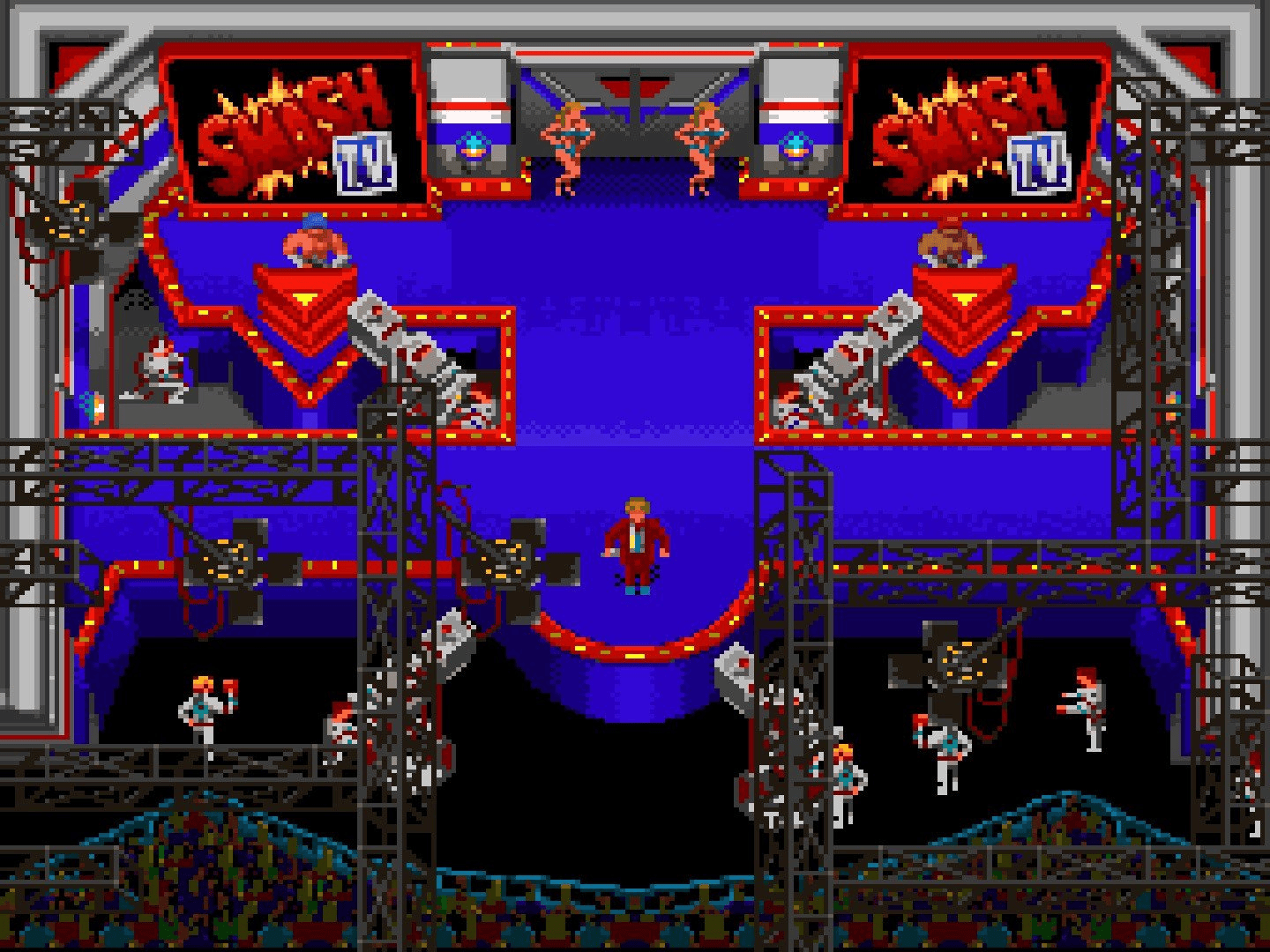 La progressione è semplice e sadica: entri, stermini, raccogli premi (soldi, lingotti, televisori, tostapane — perché sì, anche in un bagno di sangue serve un elettrodomestico nuovo), e poi passi alla stanza successiva. La struttura di Smash T.V. è quella di un incubo metodico: niente scrolling, niente panorami, solo una successione di stanze chiuse che si aprono come ferite.
