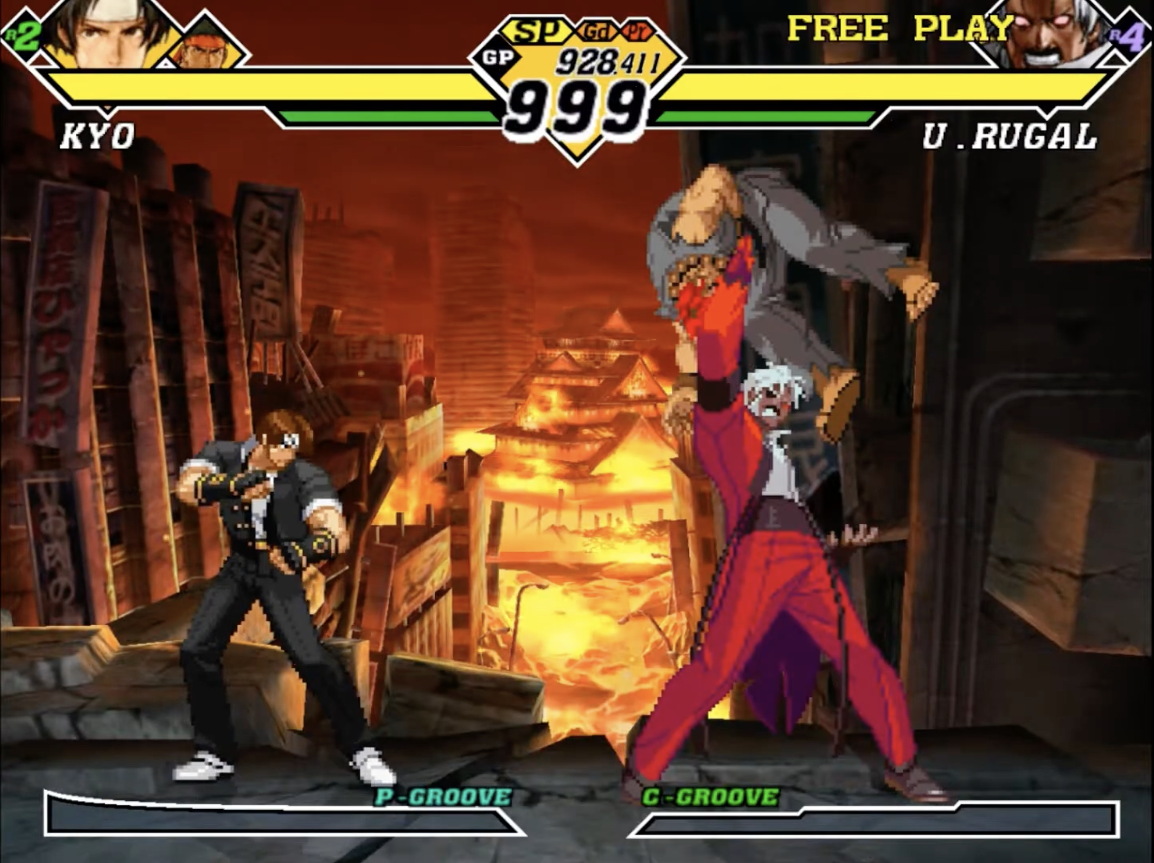 I Beatles e Rolling Stones dei picchiaduro che si stringono la mano per dare vita al crossover 2D più importante di sempre. E chi poteva essere il boss finale, anzi I boss finali, se non due crossover tra i villain più iconici delle software house di Osaka, precisamente Akuma e Rugal. Ma se Shin Akuma avevamo già avuto modo di conoscerlo in precedenza niente poteva prepararci alla furia di God Rugal. Una versione indemoniata del baffuto boss SNK che pareva uscita direttamente da un’incubo di Go Nagai. Il tutto incorniciato splendidamente in una Osaka avvolta dalle fiamme. L’ultimo grande picchiaduro 2D coronato dalla boss fight più spettacolare di sempre.