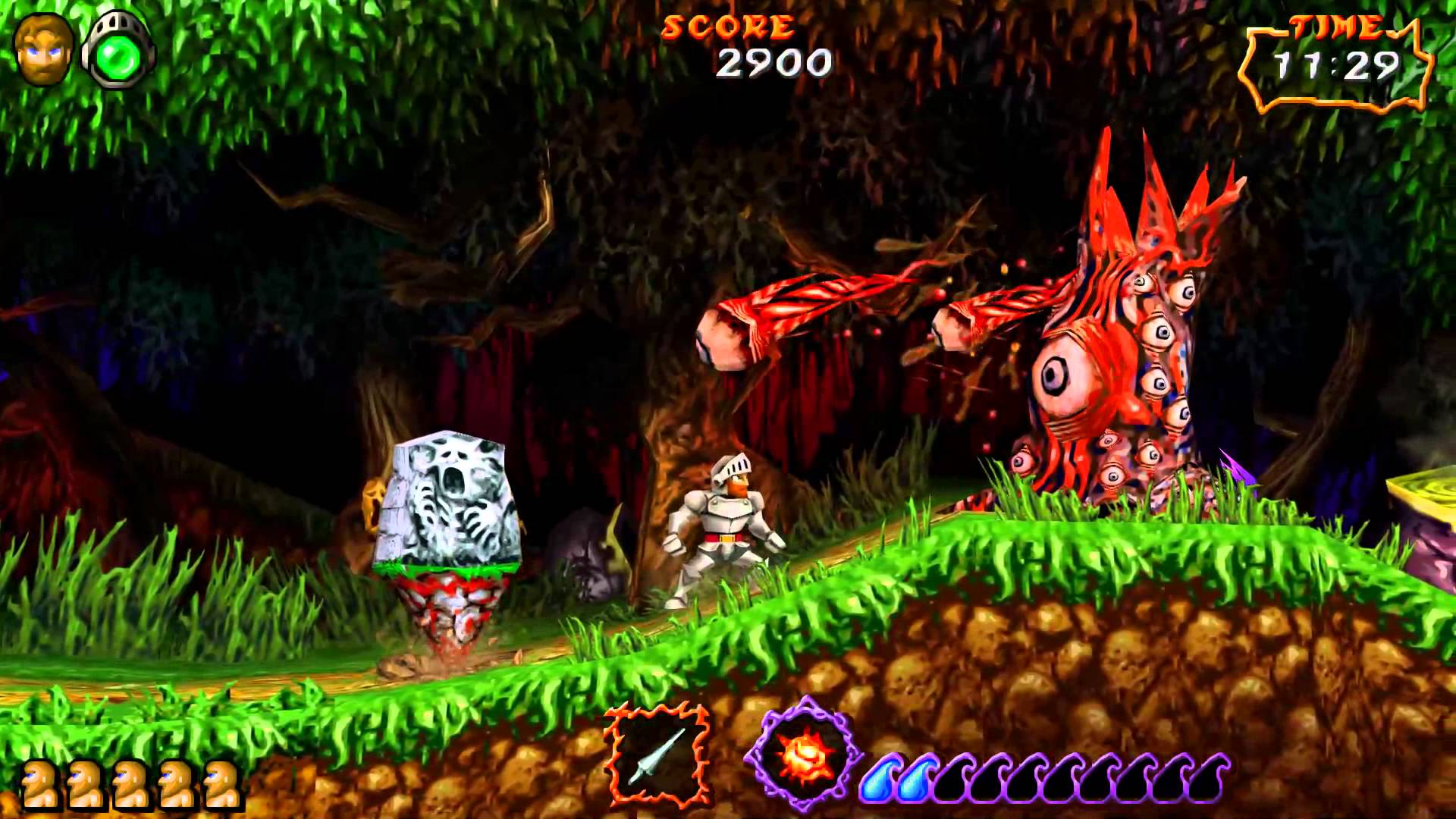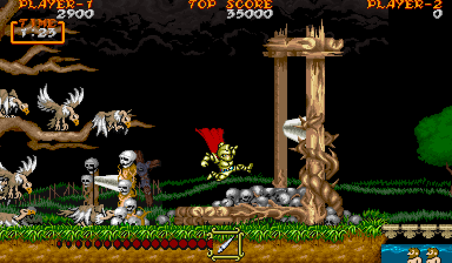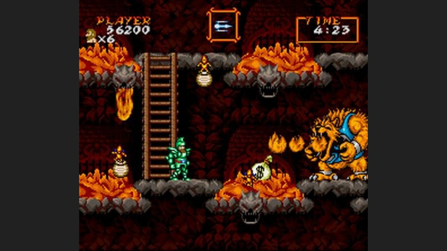 Anche la difficoltà, pur restando elevatissima, appare meglio calibrata. I livelli sono più lunghi ma più leggibili, i pattern dei nemici più chiari, la progressione più coerente. Non è meno punitivo: è più giusto. Ed è per questo che Ghouls ‘n Ghosts viene spesso ricordato come uno dei migliori titoli della sua epoca, non solo della saga.