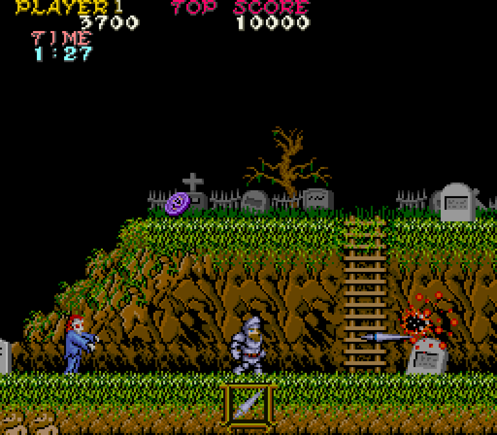 Un altro elemento che rendeva Ghosts ‘n Goblins così diverso — e così feroce — stava nel rapporto con le armi. Nei videogiochi, di solito, cambiare arma è una promessa: più potenza, più varietà, più possibilità. Qui no. Qui era una minaccia. Le lance iniziali erano oneste, dignitose, quasi rassicuranti nella loro traiettoria dritta e prevedibile. Ma il vero oggetto del desiderio erano i pugnali: veloci, a raffica, capaci di restituirti l’illusione — brevissima — di avere il controllo della situazione.