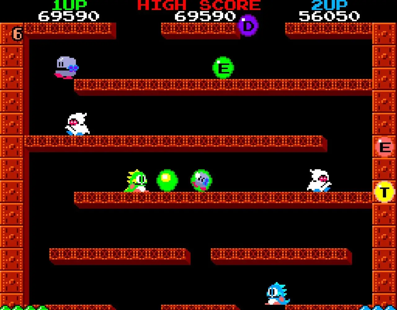 Visivamente, Bubble Bobble è un trionfo di pulizia e identità. Grafica colorata, sprite leggibili, animazioni essenziali ma espressive: tutto è studiato per essere immediatamente riconoscibile anche nel caos luminoso di una sala giochi. I draghetti sono iconici senza sforzo, i nemici hanno personalità pur nella loro semplicità, e ogni elemento sullo schermo comunica chiaramente la sua funzione. Non c’è nulla di superfluo, nulla di confuso. È un’estetica che non punta allo stupore tecnico, ma alla memoria: una volta visto, Bubble Bobble non lo dimentichi più.