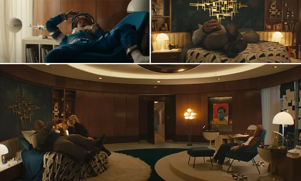 • La cucina richiama la “Kitchen of Tomorrow” della Fiera Mondiale del 1964: luci integrate, superfici bianche, robot-assistenti e tocchi cromati.