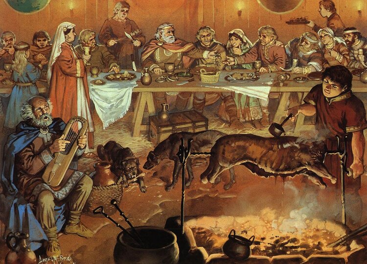 Una possibile radice simbolica si può rintracciare addirittura nell’Edda in prosa di Snorri Sturluson, testo del XIII secolo, dove compaiono le capre magiche di Thor e il cinghiale Sæhrímnir, animali che vengono cucinati e consumati per poi ritornare in vita. Non si tratta ancora della “manga meat” in senso moderno, ma dell’archetipo del grande arrosto da banchetto eroico, cioè della carne come segno di forza, abbondanza e potere.