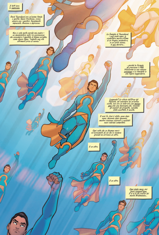 Ma dietro la sua figura si nasconde qualcosa di più oscuro e inatteso. Pagina dopo pagina, la trama si fa più limpida e quella che sembrava una convenzionale storia supereroistica si trasforma in un racconto drammatico e stratificato, rivelando il segreto e i personaggi chiave dietro il più grande eroe del pianeta: Anyman è frutto di un esperimento e dopo un anno l’ospite che veste i panni dell’eroe muore, per lasciare spazio al suo successore.