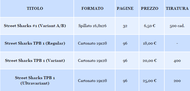 Street Sharks TPB 1 (Cartonato): Un volume di pregio (19×28 cm, 96 pagine) che raccoglie i primi tre numeri della saga americana. Il volume vanta una prestigiosa prefazione firmata da Davide Maga.